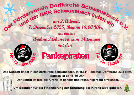 In diesem Jahr veranstaltet der Förderverein ein zweites Weihnachtskonzert am 2. Advent. Zu Gast sind die in der Gemeinde beheimateten Pankepiraten. Sie werden bekannte Weihnachtslieder singen, die zum Mitsingen animieren.